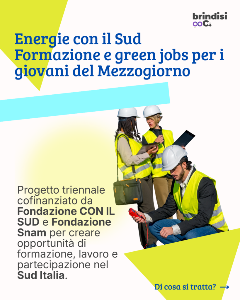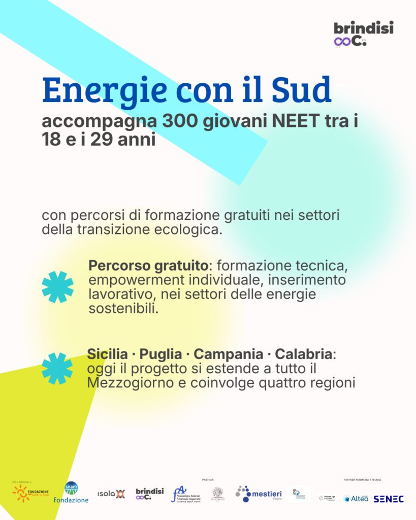 Energie con il Sud è un programma triennale di empowerment e inserimento lavorativo nel settore delle energie rinnovabili, attivo dal 2026, rivolto a giovani provenienti da contesti fragili in Puglia (Brindisi), Sicilia, Calabria e Campania.